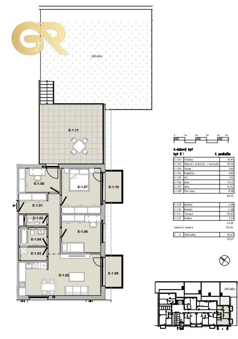 Dispozičné riešenie bytu je vstupná chodba v tvare L s priestorom pre vstavanú skriňu ( 10,95m2), kúpeľňa (3,89 m2), samostatné WC ( 1,92m2),dve izby (14,94m2 a 12,42m2) jedna so vstupom na balkón, menšia izba ( 8,38m2) so vstupom na priestrannú terasu, ktorá má 32m2 a tiež vstup na záhradku - 92m2m2, priestranná obývacia izba a kuchyňa s jedálenským kútom (26,76m2) so vstupom na balkón (4,38m2). K bytu patrí aj pivnica (2,31m2).